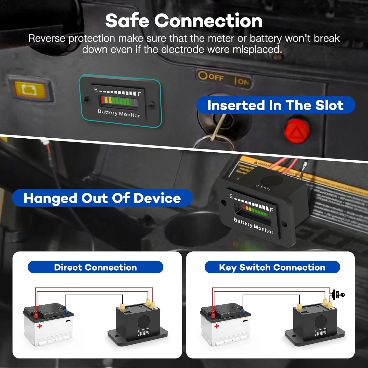 The OBDResource BM210 Battery Monitor Gauge provides a clear, real-time display of battery voltage and remaining capacity. Designed for 12V–72V systems, it features a 10-segment LED bar, waterproof housing, ultra-low power consumption with auto sleep, and reverse polarity protection—ideal for golf carts, RVs, boats, forklifts, and battery-powered vehicles.