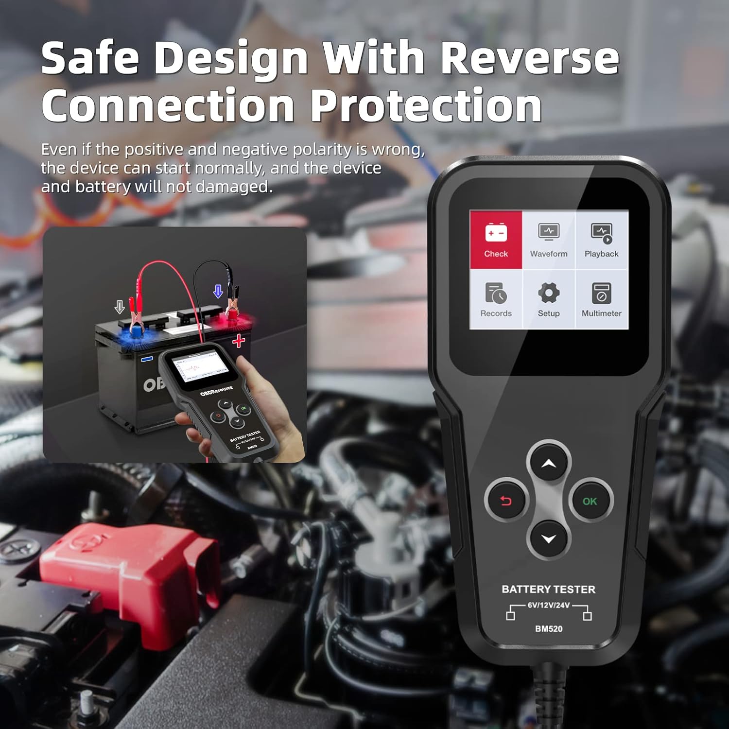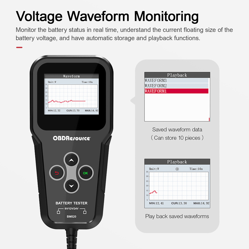 OBDResource BM520: Professional 6V/12V/24V Car Battery Tester with Real-Time Waveform & Non-Polarity Connection