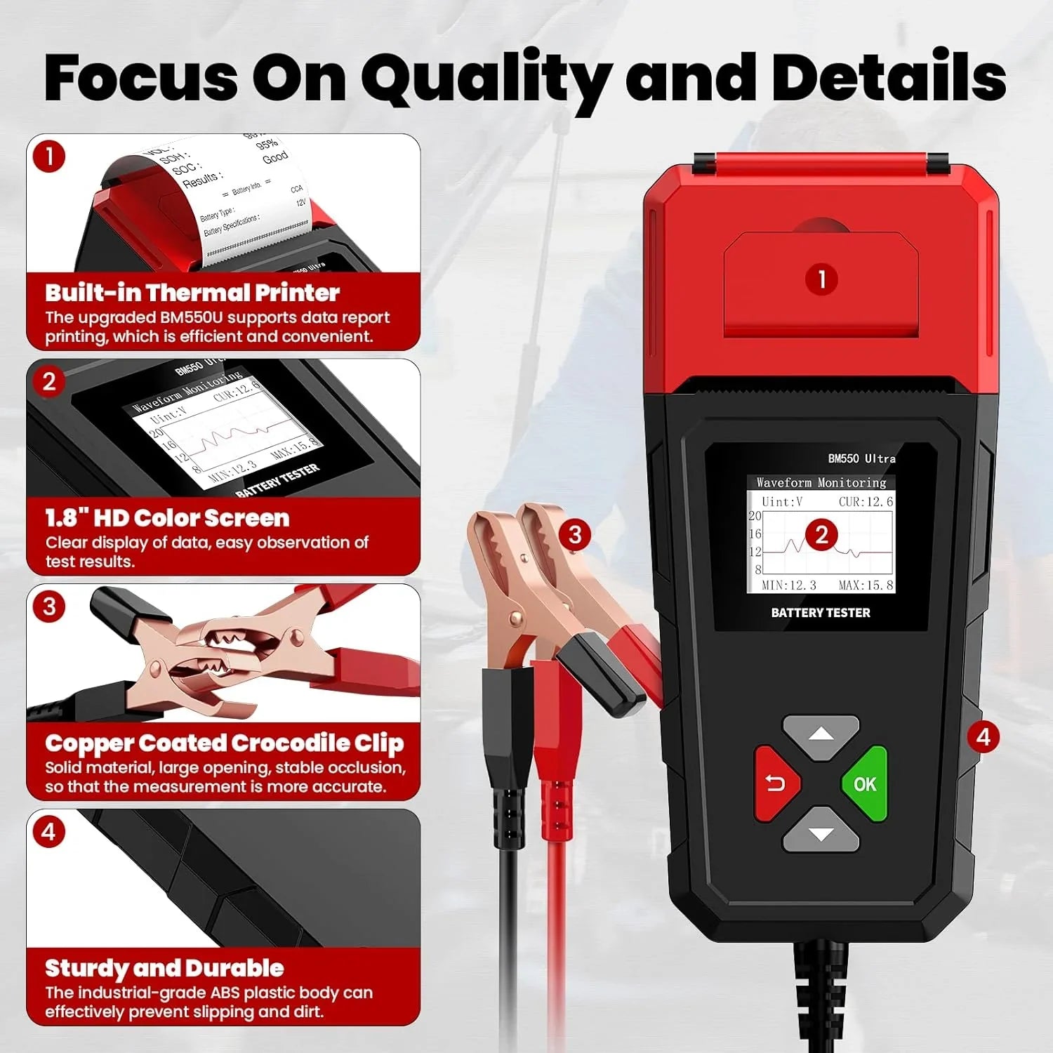 It can test all 6V/12V/24V batteries with 100-2000CCA, including regular lead-acid batteries, AGM flat plates, AGM, or gel batteries, and is equipped with a printer to print test results.