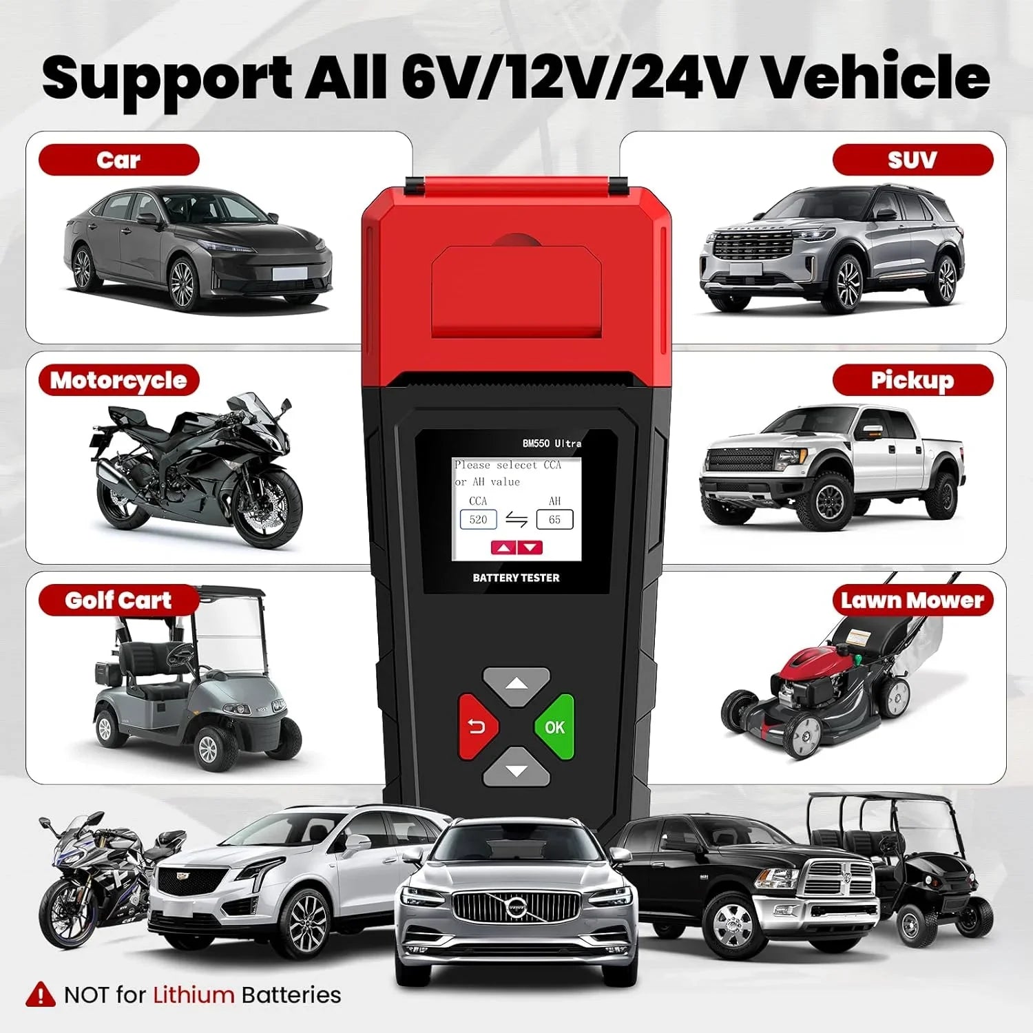 Full Compatibility with All Battery Types: Compatible with all battery specifications of 6V/12V/24V and 100-2000CCA, covering mainstream battery types on the market such as regular lead-acid, AGM flat plate, AGM, and gel batteries. One device meets diverse testing requirements.