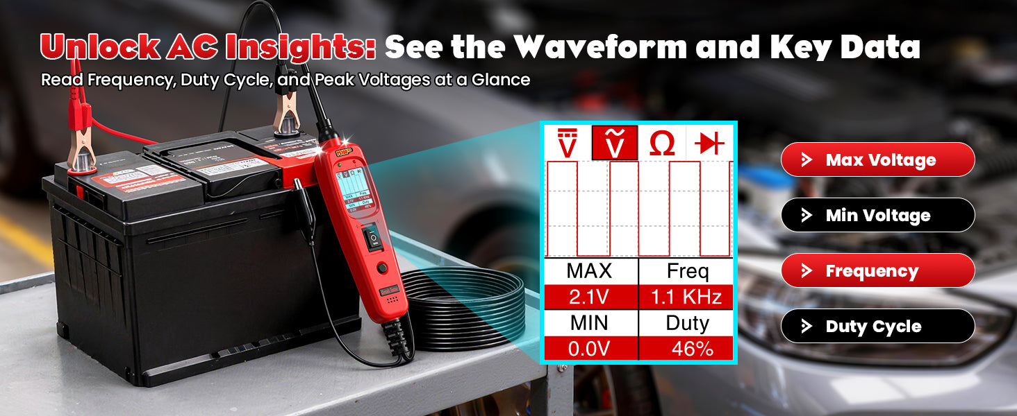 Designed for daily shop use, the PS100PRO features a durable construction, long test lead, and ergonomic handheld design. Integrated illumination improves visibility in low-light engine bays and under-dash environments.